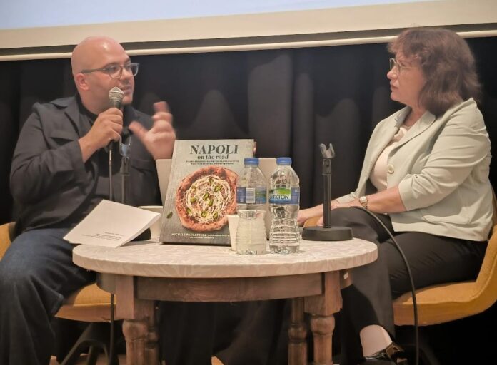 Di Maddaloni, ma londinese da quando aveva 19 anni, Pascarella nel 2024 è stato premiato come miglior pizzaiolo di Londra e d’Europa. Ha cominciato a girare per i mercati di Londra con il suo “tre ruote”. “Ed è stata – racconta, rispondendo alle domande di Gail Anderson e della sala – un’esperienza importantissima: ho scoperto il gusto della gente del posto e, soprattutto, ho scoperto anche una notevole offerta di ingredienti a chilometro zero per le mie pizze”.
