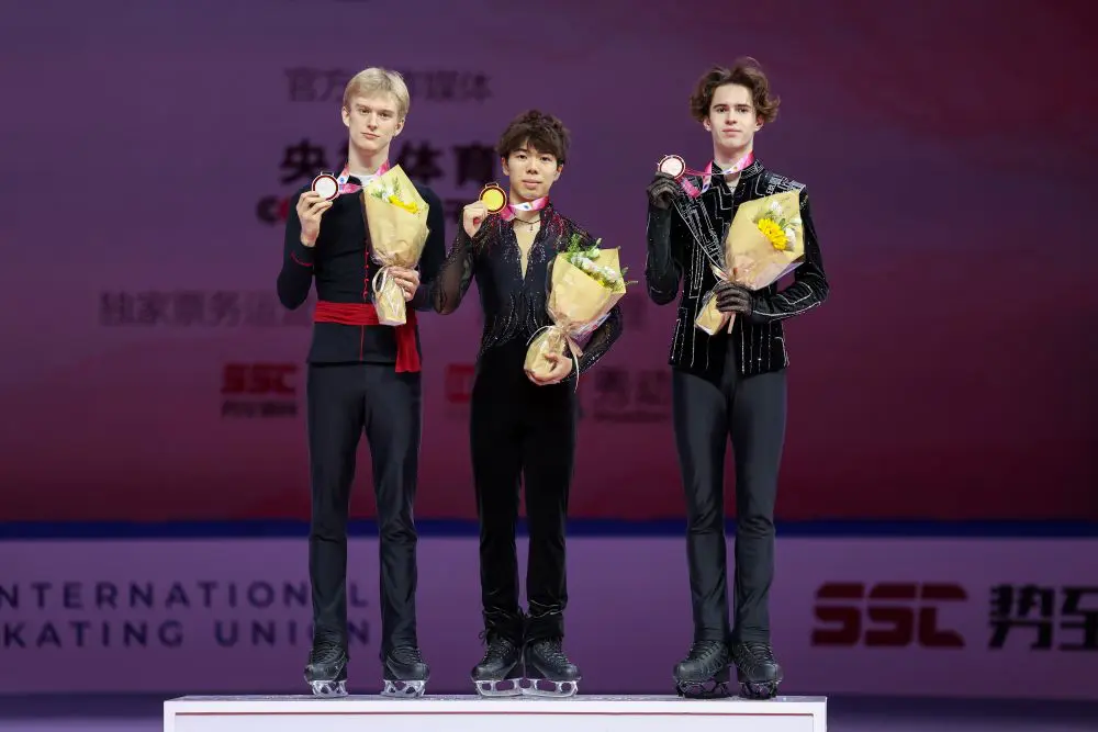 CHONGQING (CINA) (ITALPRESS/XINHUA) – Il vincitore della medaglia d’oro Sato Shun (al centro) del Giappone, il vincitore della medaglia d’argento Daniel Grassl (a sinistra) dell’Italia e il vincitore della medaglia di bronzo Mikhail Shaidorov del Kazakistan posano durante la cerimonia di premiazione della gara individuale maschile di pattinaggio alla Cup of China, tappa del Grand Prix ISU di pattinaggio di figura 2025, nella municipalità di Chongqing, nel sud-ovest della Cina, il 25 ottobre 2025.