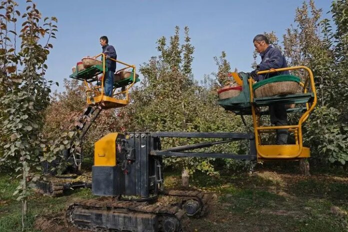 ALAER (CINA) (ITALPRESS/XINHUA) – Il personale utilizza macchine intelligenti per la raccolta delle mele in un frutteto nella città di Alaer, nella regione autonoma nord-occidentale cinese dello Xinjiang Uygur, il 23 ottobre 2025.
