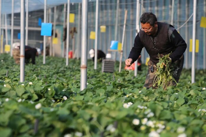 PECHINO (CINA) (XINHUA/ITALPRESS) – Alcuni lavoratori verificano la crescita delle fragole nella città di Weihai, nella provincia cinese orientale di Shandong, il 6 dicembre 2025. Con l’avvicinarsi del termine solare della “Grande Neve”, noto in cinese come “Da Xue”, gli agricoltori sono impegnati nelle attività di produzione agricola in tutto il Paese.
