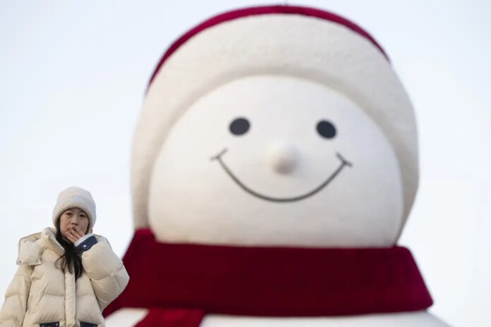 HARBIN (CINA) (XINHUA/ITALPRESS) – Una turista posa per delle foto accanto a un gigantesco pupazzo di neve al parco musicale di Qunli a Harbin, nella provincia nord-orientale cinese dello Heilongjiang, il 15 dicembre 2025. Il pupazzo di neve di quest’anno, alto 19 metri e realizzato con circa 3.000 metri cubi di neve, è più alto di un metro rispetto a quello dello scorso anno.