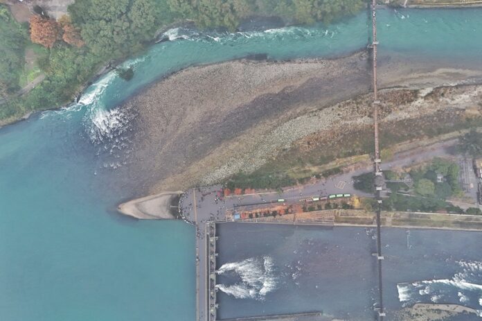 CHENGDU (CINA) (XINHUA/ITALPRESS) – Una foto aerea scattata da un drone il 6 dicembre 2025 mostra la deviazione idrica “a bocca di pesce” (in basso a sinistra) nella città di Dujiangyan a Chengdu, nella provincia cinese sudoccidentale del Sichuan.