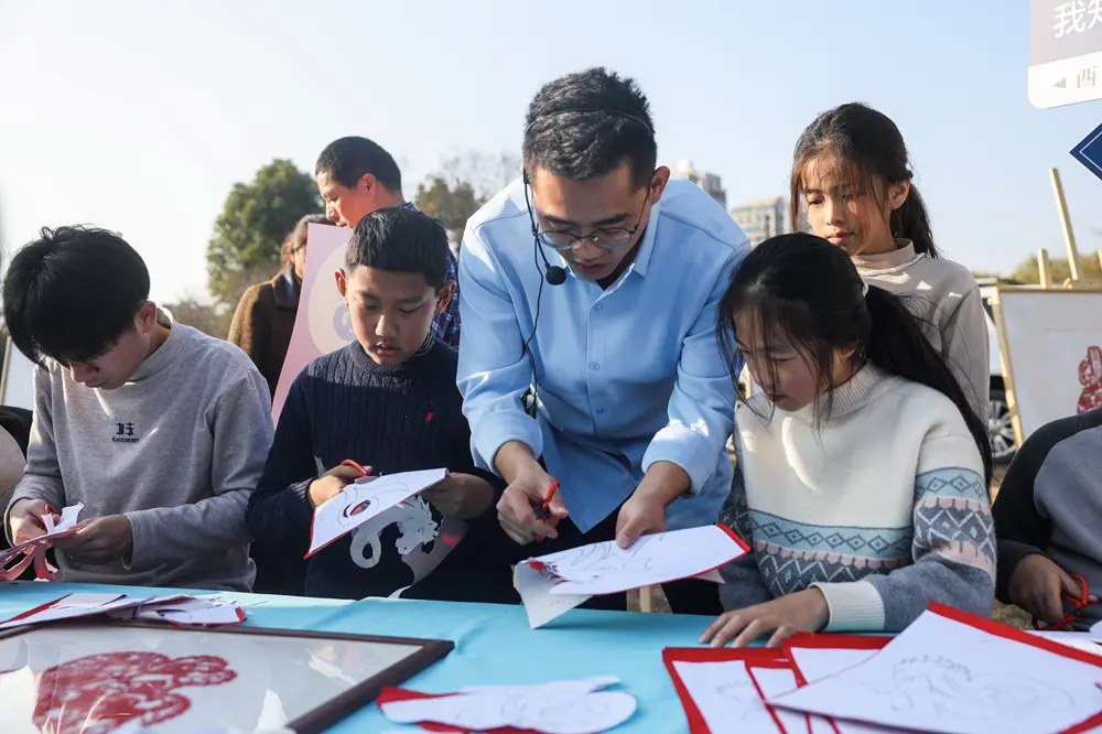 JIANDE (CINA) (XINHUA/ITALPRESS) – Un membro dello staff (al centro) guida gli studenti alla scoperta dell’arte del ritaglio della carta a una fiera contadina nella cittadina di Qiantan a Jiande, nella provincia cinese orientale di Zhejiang, il 6 dicembre 2025.