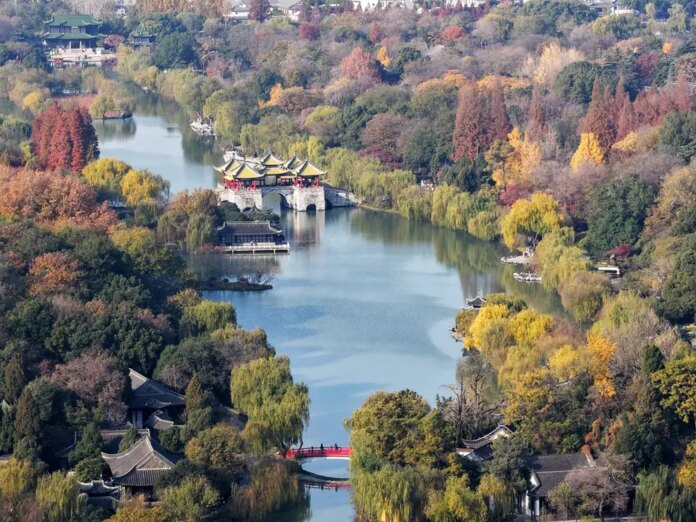 PECHINO (CINA) (XINHUA/ITALPRESS) – Una foto aerea scattata con drone il 5 dicembre 2025 mostra una veduta dell’area panoramica dello Slender West Lake a Yangzhou, nella provincia cinese orientale di Jiangsu.