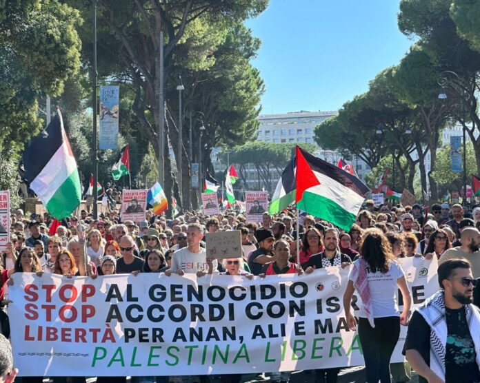 ROMA (ITALPRESS) – Migliaia di persone si sono ritrovate a Porta San Paolo, a Roma, per partecipare alla manifestazione nazionale per la Palestina promossa dal Movimento degli studenti palestinesi, in sostegno alla Global Sumud Flotilla. All’iniziativa hanno aderito numerose realtà associative e sindacali, tra cui Usb, Cgil, Anpi e Arci, oltre a diversi collettivi universitari come Osa, Cambiare Rotta e Zaum.