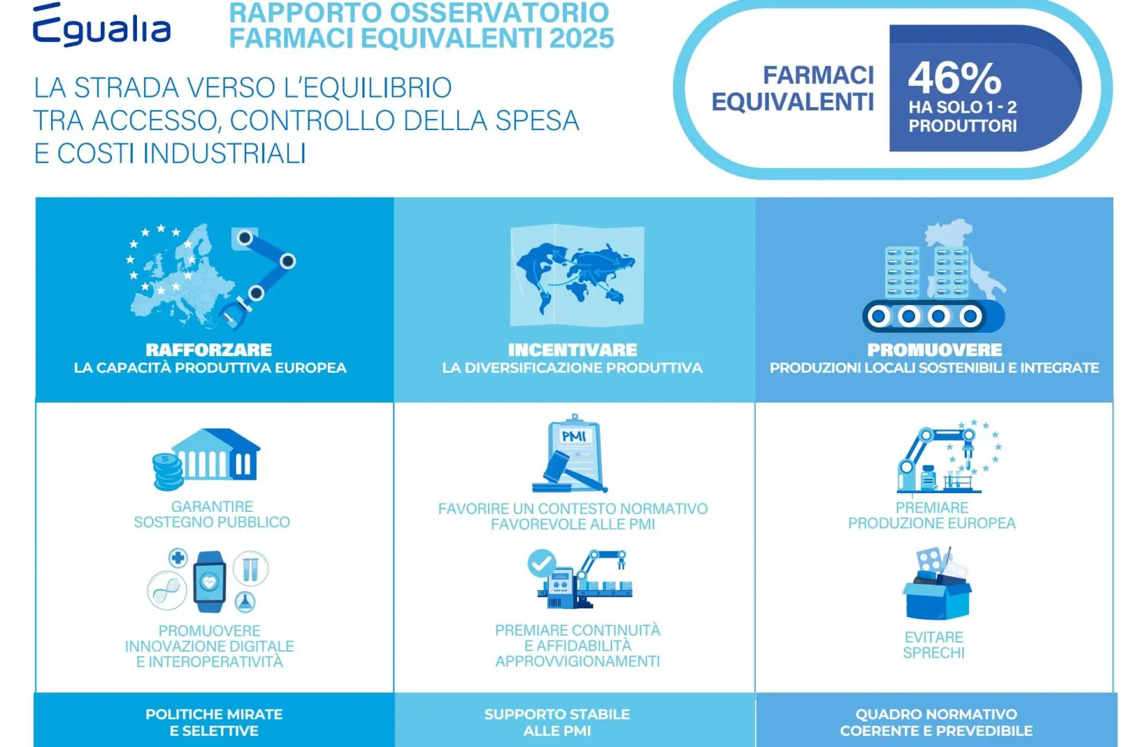 ROMA (ITALPRESS) – Non sono semplici commodity, ma beni meritori da difendere: i farmaci equivalenti rappresentano la spina dorsale delle terapie croniche e un presidio di salute pubblica che lo Stato ha il dovere di tutelare. È il messaggio che emerge dal decimo Rapporto dell’Osservatorio Egualia-Nomisma, presentato oggi a Roma, che lancia un appello: senza misure di tutela e una chiara agenda industriale, la crisi rischia di diventare irreversibile. Il comparto in Italia raggruppa 102 imprese per un totale 10.900 addetti diretti, per un valore della produzione che ha toccato i 6,4 miliardi e 1,6 miliardi di valore aggiunto diretto generato. Tuttavia, l’aumento dei costi di produzione (+32% tra il 2019 e il 2023, +9,5% solo nell’ultimo anno), trainato dal rincaro delle materie prime (+40,6% sul periodo), ha eroso i margini, mettendo sotto pressione la redditività di un settore che opera già con prezzi regolati e fermi da anni. Il settore in Italia conta 102 imprese, 10.900 addetti diretti, 6,4 miliardi di valore della produzione e 1,6 miliardi di valore aggiunto diretto generato. Negli ultimi anni le aziende hanno investito e consolidato occupazione, ma l’aumento dei costi (+32% tra 2019 e 2023, +9,5% solo nell’ultimo anno) ha messo sotto pressione la redditività.
