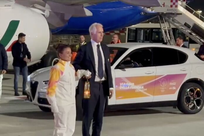 ROMA (ITALPRESS) – La fiamma olimpica di Milano-Cortina 2026 é atterrata a Fiumicino dopo il volo partito da Atene, dove è stata consegnata alla delegazione italiana. Ad accompagnare la fiaccola il presidente della Fondazione Milano-Cortina, Giovanni Malagò, il numero 1 del Coni, Luciano Buonfiglio e la tennista Jasmine Paolini, tedofora allo stadio Panathinaiko.