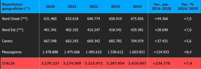 La regione che presenta l’incidenza delle prestazioni di invalidità complessive (previdenziali e civili) sul totale abitanti più elevata è la Calabria (13,2%). Seguono la Puglia (11,6), l’Umbria (11,3) e la Sardegna (10,7). Chiudono Piemonte, Lombardia e Veneto tutte con il 5,1%. A livello provinciale svetta il risultato di Reggio Calabria (14,99 prestazioni erogate ogni 100 abitanti). Subito dopo scorgiamo Lecce (14,24) e Crotone (13,88). Le realtà territoriali meno “interessate” dal fenomeno dell’inabilità sono Trieste (4,39 per cento), Firenze (4,12) e Prato (3,89). Se facciamo un focus solo sulle pensioni erogate agli invalidi civili, nel 2024 la spesa complessiva, come dicevamo più sopra, è stata di 21 miliardi di euro; quasi la metà (il 46,6% del totale) viene erogata nel Mezzogiorno. L’importo annuale più importante pari a 2,73 miliardi viene corrisposto alla Campania. Seguono i 2,67 miliardi dati in Lombardia e i 2,38 miliardi dovuti al Lazio. L’importo mensile medio nazionale è di 501 euro. Tornando a osservare l’andamento del numero delle pensioni di invalidità civile, tra il 2020 e il 2024 la regione che ha subito l’incremento percentuale più elevato è stata la Puglia (+14,1 per cento). Seguono la Basilicata (+12,2) e la Calabria (+11,9). Per contro, le realtà dove l’aumento è stato più contenuto sono la Toscana (+2,7) e il Friuli Venezia Giulia (+2,6).