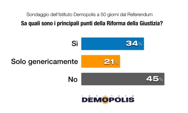 Ma c’è da dire che moltissimi italiani non sanno ancora esattamente su cosa si voterà: lo confermano sia un sondaggio di Demopolis, secondo cui poco più di un terzo (34%) degli elettori affermano di conoscere “i punti principali” della riforma; e soprattutto il sondaggio di Ipsos, secondo cui solo il 10% degli italiani si ritiene “molto informato”, a fronte di un 54% che si definisce invece “poco” o “per nulla” informato.