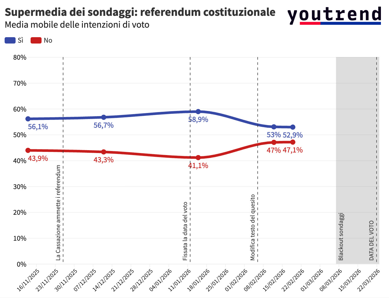 Anche qui, i sondaggi ci aiutano a capire quanto siano importanti le motivazioni del voto per determinare l’esito di questa consultazione: da tempo, infatti, il Governo Meloni ha un indice di approvazione negativo, ossia una prevalenza di giudizi negativi da parte degli italiani – pur restando molto solido sul piano delle intenzioni di voto, dove il centrodestra continua a essere la coalizione più competitiva sulla carta. Sempre l’istituto Ipsos, infatti, ci dice che se al referendum si votasse anche sulla popolarità del Governo i contrari (54%) supererebbero abbastanza nettamente quelli favorevoli (46%). E questo può spiegare come mai, nell’ultimo periodo, i sondaggi abbiano registrato una forte crescita del “No”, arrivato – nelle rilevazioni più recenti – ad appaiare se non addirittura a sopravanzare i “Sì”, che erano partiti in vantaggio quando la riforma era stata appena approvata e il referendum è stato indetto. L’ultima Supermedia di Youtrend (19 febbraio) registra una situazione di sostanziale equilibrio, con il “Sì” al 52,9% contro il 47,1% dei “No”: un divario che in un mese si è ridotto di oltre 12 punti.