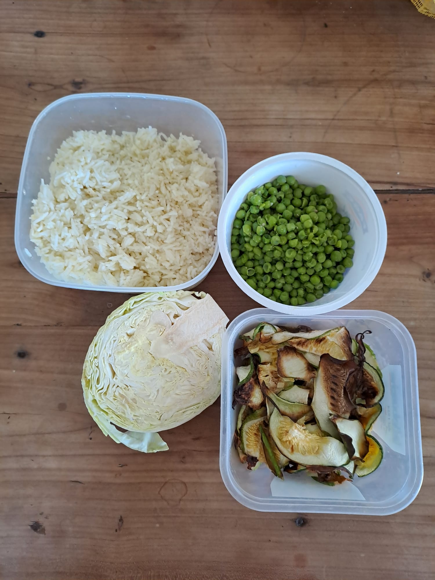 Nel mentre, scottate appena in acqua bollente e salata le foglie di cavolo cappuccio (ma andranno bene anche di verza o coste), scolatele e fatele asciugare bene su un canovaccio, quindi asportate con un’incisione a triangolo la parte dura centrale. Su un doppio foglio di carta forno, disponete le foglie una accanto all’altra, leggermente sovrapposte, così da formare una base rettangolare, sui cui disporre -con l’aiuto di una spatola- il riso ormai freddo. Pressate bene, salate e passate allo strato successivo. Nel mio caso, piselli saltati in padella, ma andrà bene qualsiasi tipo di verdura cotta. A questo punto un po’ di proteine, che non devono mai mancare, come direbbero i miei figli ben poco veg. Ho optato per delle fette di speck, ma anche qui potete valutare qualsiasi altro affettato, dal prosciutto cotto al tacchino, dalla mortadella alla bresaola ecc.