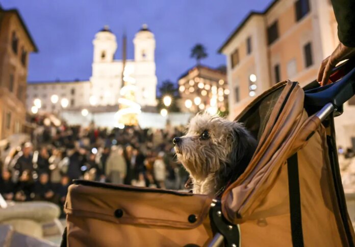 ROMA (XINHUA/ITALPRESS) – Un cane fotografato su un passeggino a Piazza di Spagna a Roma, in Italia, il 14 dicembre 2025.